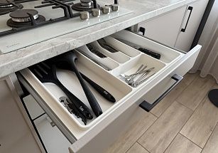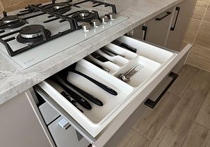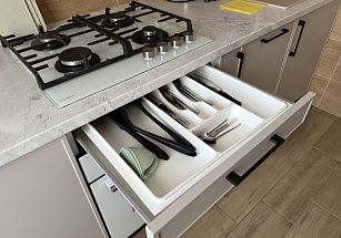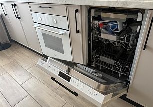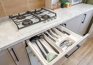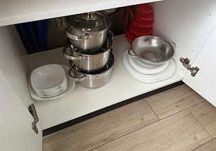 кухней, на которой имеются холодильник, плита, микроволновка, посуда;